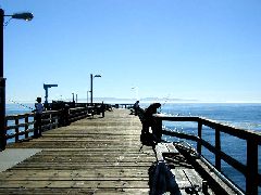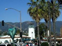 このピアはUCSB脇のピアと違いお店が並び人の数も凄い量でした。 LAの友人の話だと数年前に火事で半分くらい焼け落ちたらしいのですが、 今ではそういう跡形もなく復活しており、大変賑わっています。 ピアには車でも入って行けますが、健康な方であれば脇の無料駐車場に車をとめて 歩いた方がずっと気持ちいいと思います。 また、ピアの前の交差点には灯台とイルカがジャンプしている銅像があります(Pic.-5参照)。 灯台の建物は今ではカフェになっています。